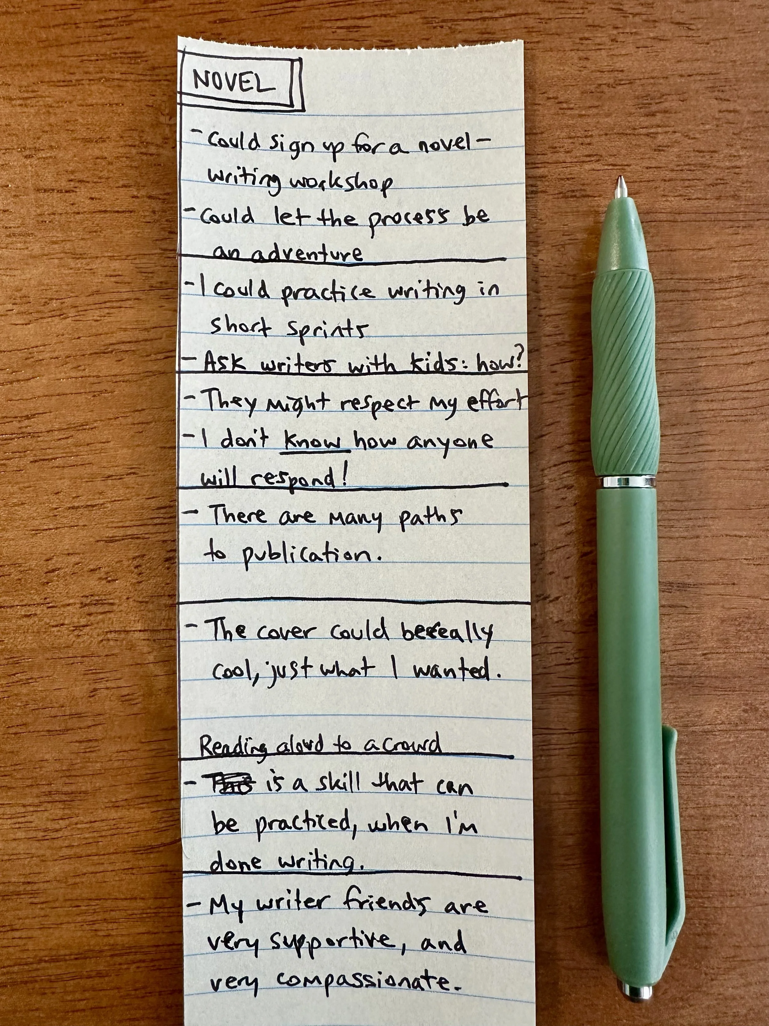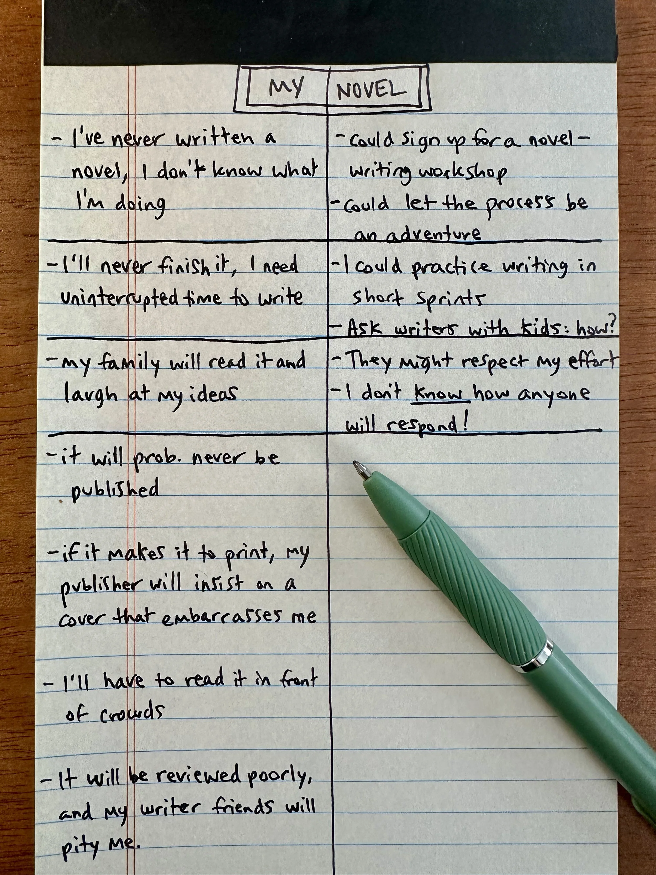 3.) In the left-hand space, list of all the worries you have about the project. No one needs to see this list, so write whatever thoughts arise, even if they “don’t make sense.” For example, if I want to start writing a novel, I might jot down–